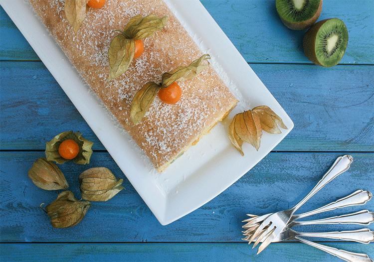 Jetzt wird es sommerlich auf dem Kuchenteller. Diese Bikuitrolle ist gefüllt mit leckerer Vanillecreme und Früchten wie Kiwi, Orange, Ananas und Litschies.