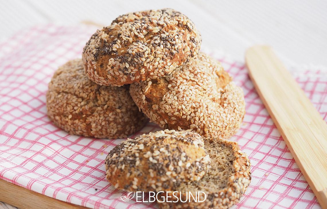 Hier stecken nur gute Zutaten drin: statt Mehl – Flohsamen und Chiasamen, dazu Magerquark und gemahlene Mandeln. Mit Sesam- und Chiasamen werden die Brötchen formbar.