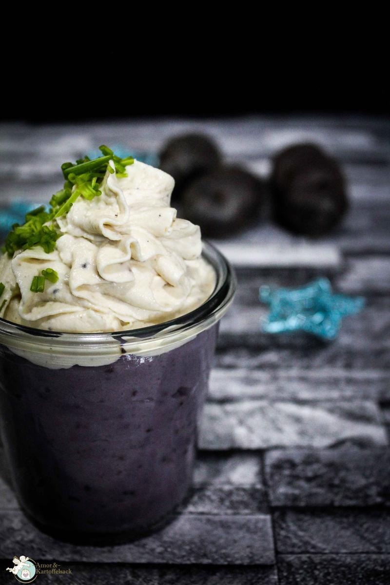 Ein wahrer Hingucker für Augen und Gaumen! Aus lila Kartoffeln wurde ein leckeres Püree und darauf Platz nimmt eine wunderbar luftige Creme mit Frischkäse und ein Bisschen Fisch.