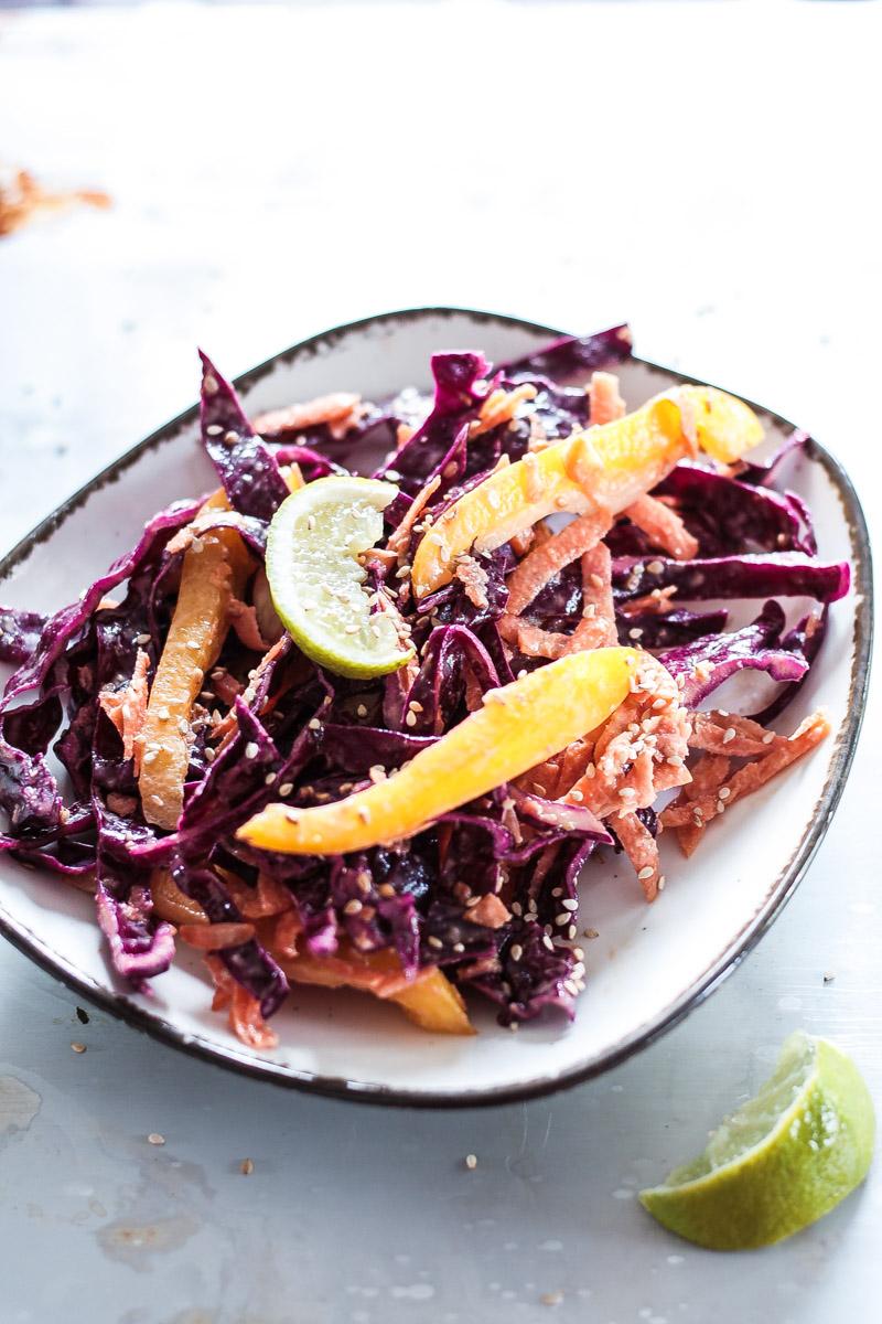 Das Rezept für ein frisches Essen voller Aroma: Süßkartoffeln werden mit Sesam und Spinat gebraten & mit Asia-Gurkensalat serviert. Vegan und so lecker!