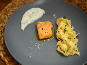 Zum Lachs habe ich mir als Beilage frische, selbst gemachte Nudeln überlegt. Den Nudelteig mache ich immer ohne Eier und ausschließlich aus Hartweizengrieß.