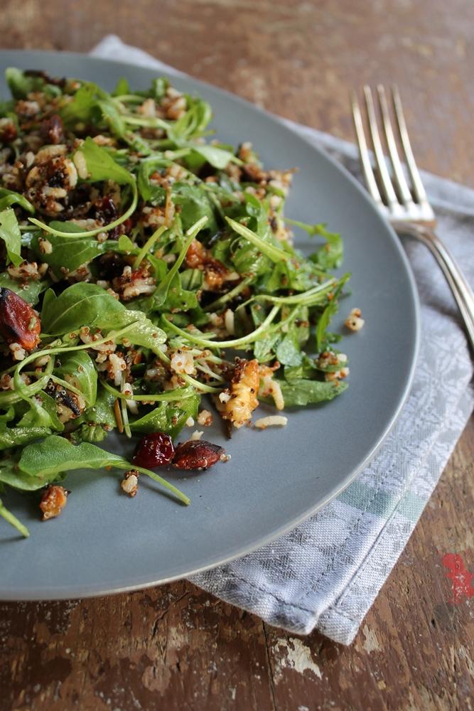 5 Canihua, Basmati- und Wildreis, frittierte Zwiebeln, Cranberries, Walnüsse und Mandeln ergeben einen wunderbaren, frischen Salat, der sich auch sehr gut als Büro Lunch eignet.