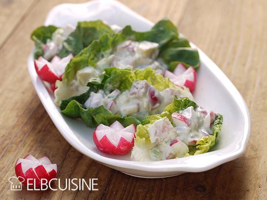 Hierbei wurde der Matjes-Salat meiner Mutter neu interpretiert. Die Rolle des knackigen Apfels übernehmen die Radieschen. Der Salat wird in kleinen Salatschiffchen serviert und das Dressing mit Joghurt gemacht.