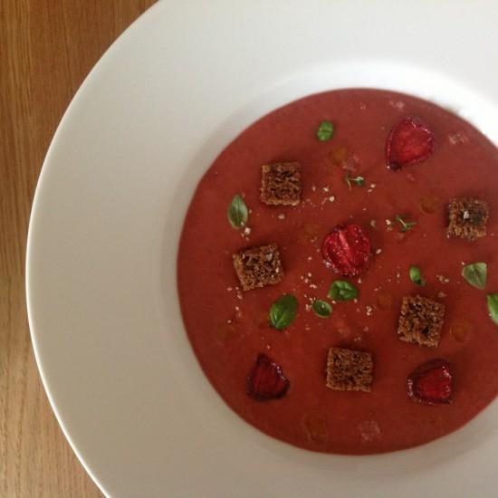Die schönste Suppe der Welt: Erdbeer-Gazpacho, mit schwarzem Pfeffer, Erdbeer-Confit, Basilikum, Olivenöl und überhaupt.
