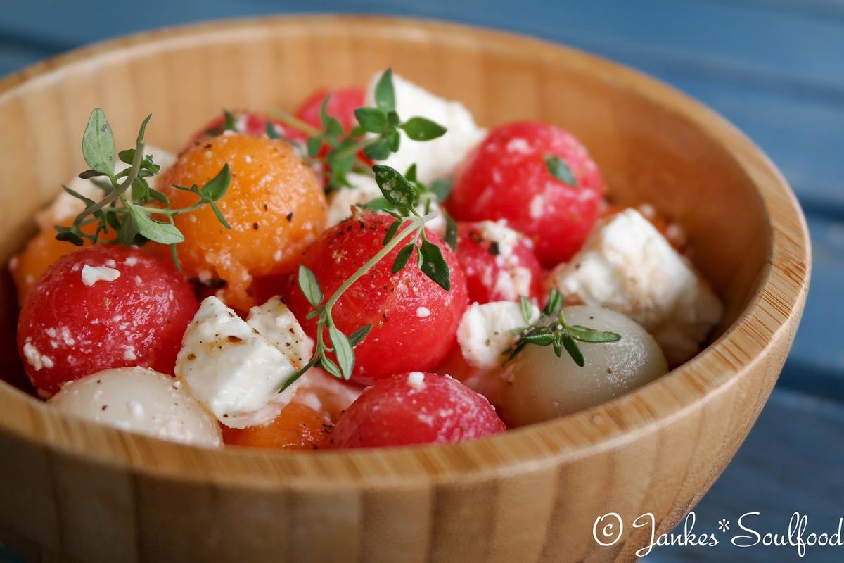 Ein leckerer, leichter Sommersalat mit fruchtiger Cantaloupe-Melone, salzigem Feta und cremiger Avocado. Der bringt selbst bei schlechtem Wetter das Sommerfeeling in das Haus!