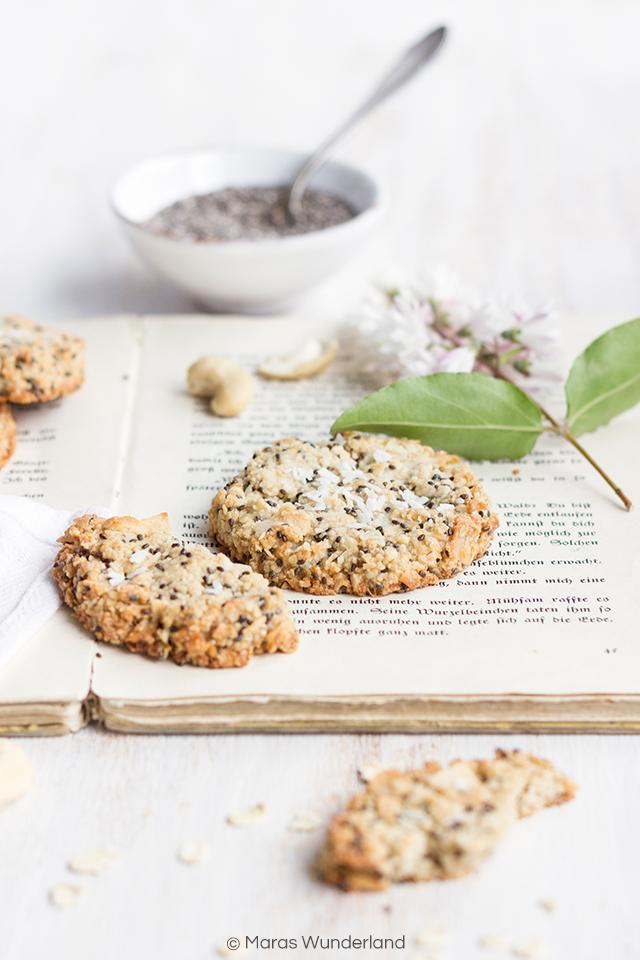 Gesunde und vegane Chia Zitronen Cookies mit Haferflocken, Cashewkernen, Kokosöl und Kokosraspeln. Gesüßt mit Reissirup. Schnell und einfach zubereitet.