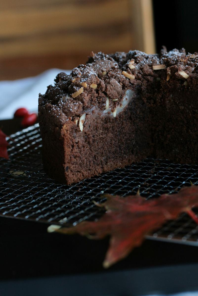 Dieser saftige Schokokuchen schmeckt nach Herbst: Birnen und Rotwein machen ihn besonders saftig. Für ganz viel Crunch sorgen knusprige Streuseln mit Mandeln.