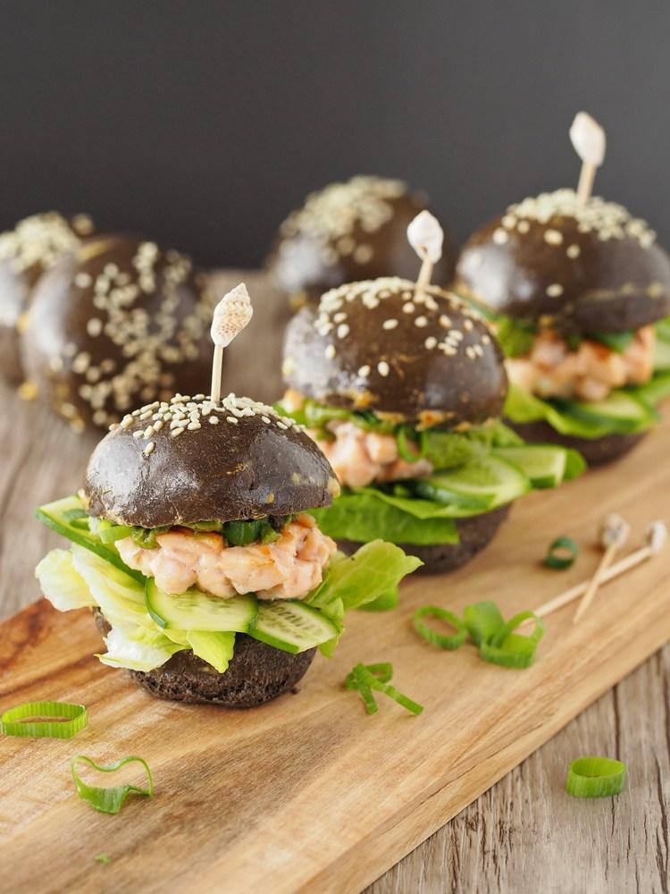Burger-Buns mit Sepia-Tinte, dazu Lachs und eine Creme aus Avocado, Ingwer und Matcha... passt alles zusammen wie die Faust aufs Auge :)