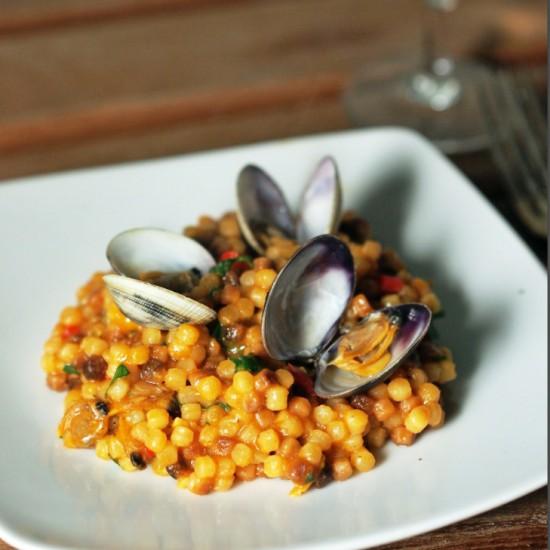 Venusmuscheln in kräftigem Safransud. Almejas luna, das Signature dish meiner Lieblings-Chiringuito in Zahara de los Atunes.