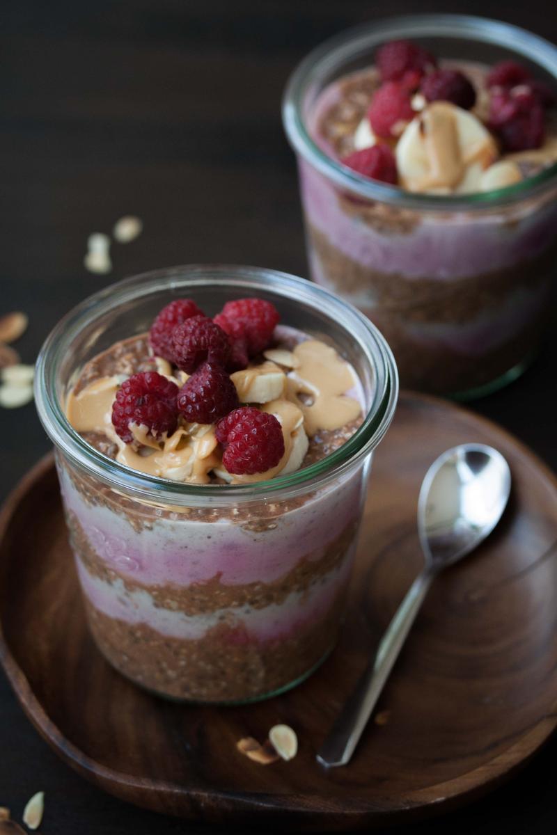 Cremige, vegane Overnight Oats mit erfrischendem Himbeer-Sojajoghurt. Morgens einfach aus dem Kühlschrank nehmen und genießen oder mit ins Büro nehmen.