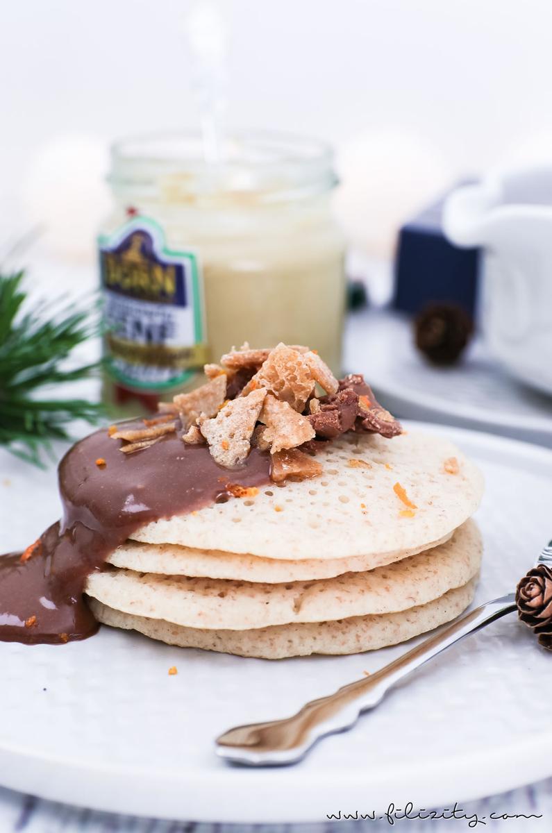 Außergewöhnliches Weihnachts-Rezept zum Dessert: Marokkanische Crêpes (Baghrir) mit Schoko-Orangen-Senf-Soße, würzigem Orangenkaramell und Senfpralinen.