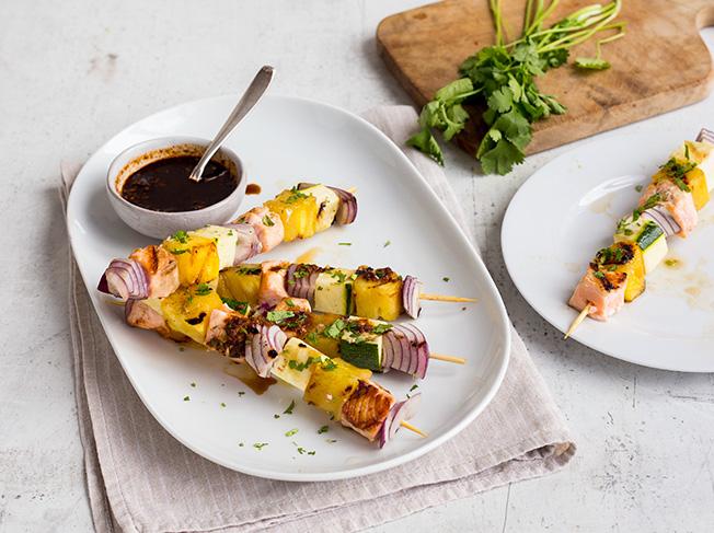 Ab auf den Grill und dann jeden Bissen genießen. Die Spieße mit Lachs, Ananas, Zucchini und Zwiebel sorgen getunkt in den scharfen Asia-Dip für sommerliches Grillfeeling.