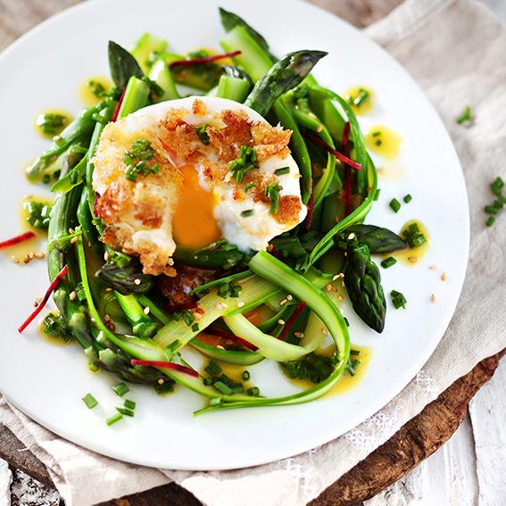 Grüner Spargelsalat mit pochiertem Ei, Schnittlauchvinaigrette und gerösteten Sesam-Toastbröseln. Der perfekte Sommergenuss, leicht, saisonal und unglaublich lecker.