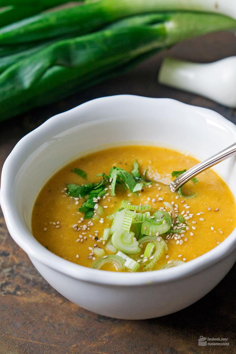 Sämig, orientalisch und mit einer säuerlichen Note: Die Rote Linsensuppe mit Süßkartoffeln und einem Topping von Frühlingszwiebeln, Koriander und Sesam