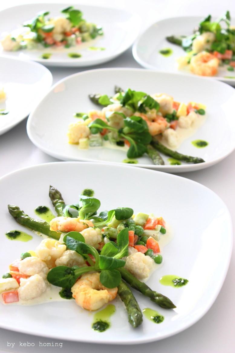 Ein gut vorzubereitender Frühlingssalat mit gebratenen Scampi, grünem Spargel, knackigen Gemüsewürfeln in einer Bärlauch-Joghurt-Mayonnaise, aromatisiert mit Bärlauchöl...