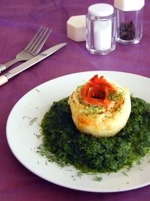Lachs im Blätterteig auf Spinat oder einfach Lachsrosen. Mit leckerem Kräuterfrischkäse aus Dill, Petersilie, Salz und Pfeffer ein absoluter Leckerbissen.