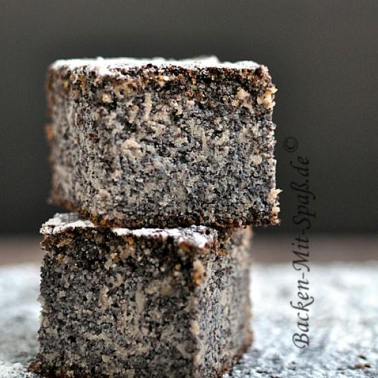 Saftig leckerer Mohnkuchen mit Grieß, Mandeln, Äpfeln, Vanille und Rosinen auf einem knusprigen Buttermürbeteig