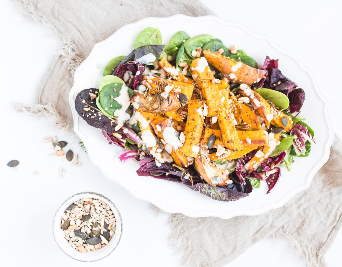 Wer Feldsalat mag, wird diesen Salat lieben, der passt hervorragend zu den gedämpften Süßkartoffel und mit dem cremigen Tahini Dressing und den Walnusskernen zaubert man in Handumdrehen einen herrlichen gesunden Salat zum Sattessen!