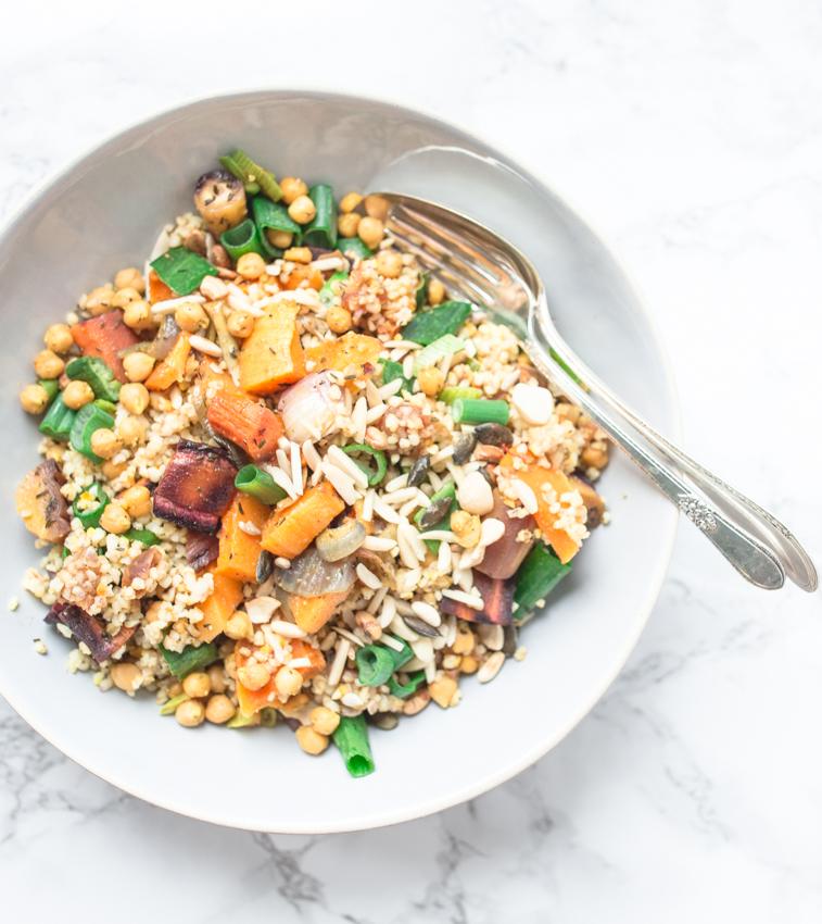 Safran Bulgur mit Karotten, Süsskartoffeln, Kichererbsen und Frühlingszwiebeln an einer Baharat Gewürzmischung. Dazu Tahini-Orangen Dressing und der Tag kann nicht besser enden.