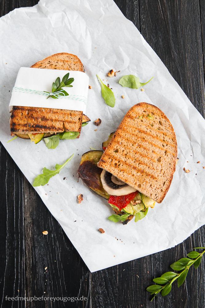 Zwei Scheiben geröstetes Brot, Gemüse aus dem Ofen, dazu frischer Rucola, Walnüsse und Zitronen-Basilikum-Aioli - so einfach kann ein gutes Sandwich sein!