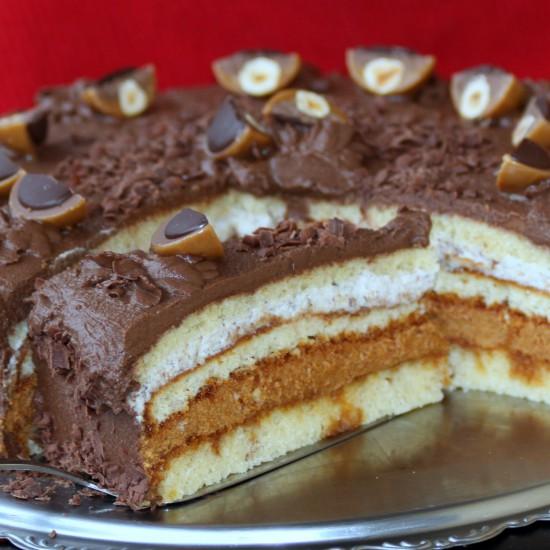 Für die Pralinen Torte ist der Biskuit Boden im Handumdrehen zubereitet. Zwischen den Böden verbirgt sich eine leichte Buttercreme. Fein gehackte Pralinen sind das absolute „Highlight“ in der Torte.