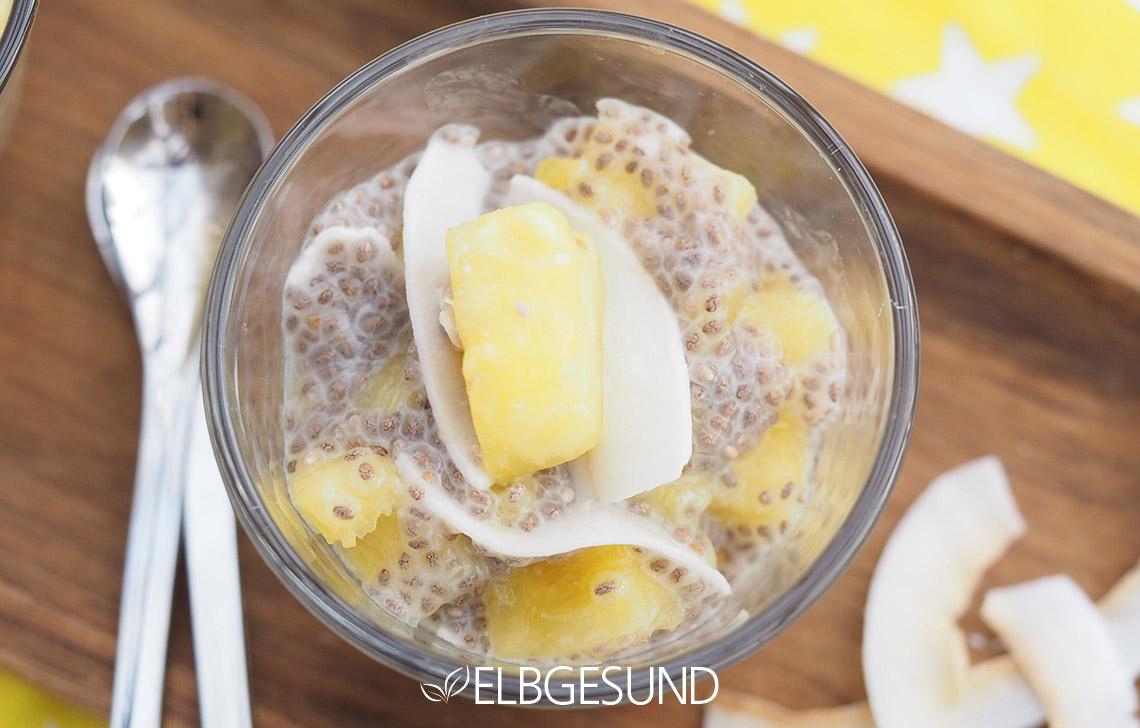 Die Kombination aus süßer Ananas, cremiger Kokosmilch, knusprigen Kokoschips und Chiasamen ist wirklich lecker und irgendwie bringt sie ein bißchen Sommerfeeling.