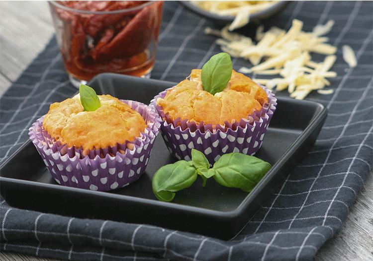 Perfekt für´s Buffet oder als herzhafter Snack - Muffins mit getrockneten Tomaten, Käse und Basilikum.