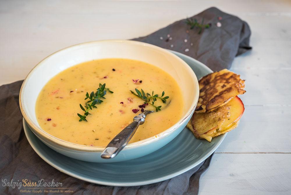 Die Basis für die cremige Kartoffelsuppe bilden die Kartoffeln und jede Menge Gemüse, das dann mit Gemüsebrühe aufgekocht wird. Dazu gibt es frischen Majoran und angebratene Äpfel.
