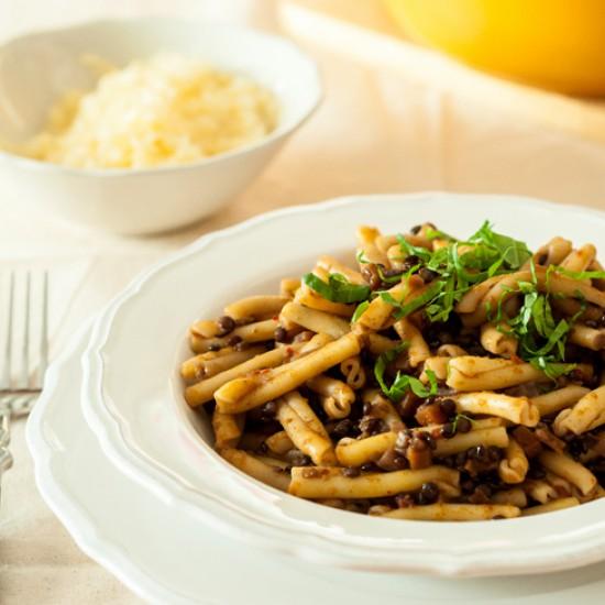 Hausgemachter Pastateig mit Ajvar, dazu Petersilie, Feta, Zitrone, etwas Knoblauch und ein Schuss gutes Olivenöl - fertig ist ein perfektes Sommer-Essen!