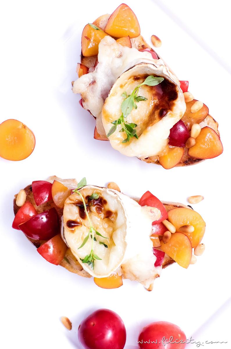 Brotzeit: Einfaches Rezept für Mirabellen – / Kirschpflaumen-Bruschetta mit gratiniertem Ziegenkäse – Perfekt als Vorspeise, Party-Food oder als Snack zwischendurch.