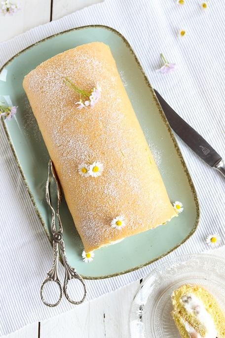 Saftiger Vanille Biscuit mit einer fruchtigen Brombeerfüllung und einer leichter Vanille Diplomate Creme. Einfaches Rezept und das beste Dessert für den Sommer. Noch die letzten Beeren geniessen mit dieser Roulade.