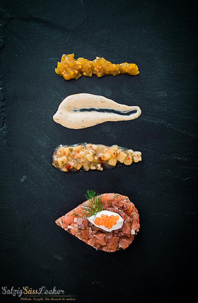 Das traditionelle Rezept eines Graved Lachs benötigt nur Salz Zucker und Dill. Darin wird der Fisch 1–2 Tage gebeizt. In diesem Rezept kommt Gin als zusätzliches Aroma ins Spiel und macht dabei eine sehr gute F