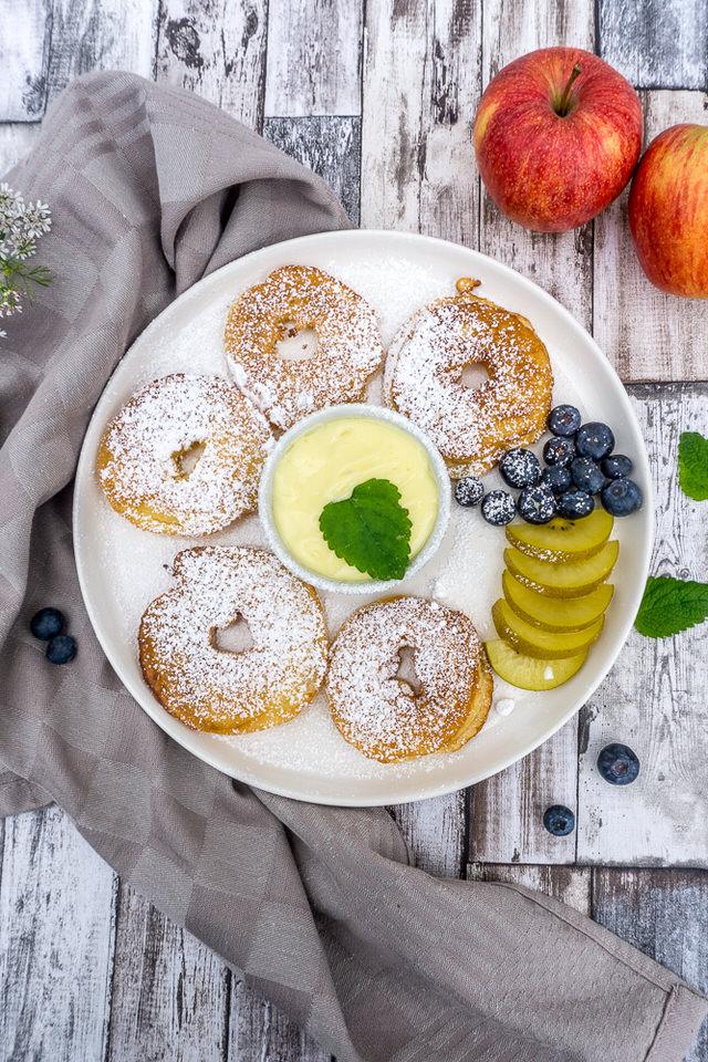 Diese Apfelküchlein werden knusprig golden gebraten und mit viel Puderzucker bestäubt. Sie sind ein schnelles und einfaches Dessert oder auch ein leckerer Snack.